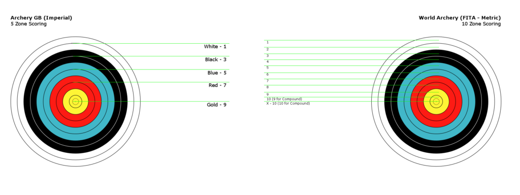 Imperial Rounds (Archery GB) are shot at distances measured in yards, and use 5 zone scoring (described above) for outdoors and generally 10 zone scoring for indoors.